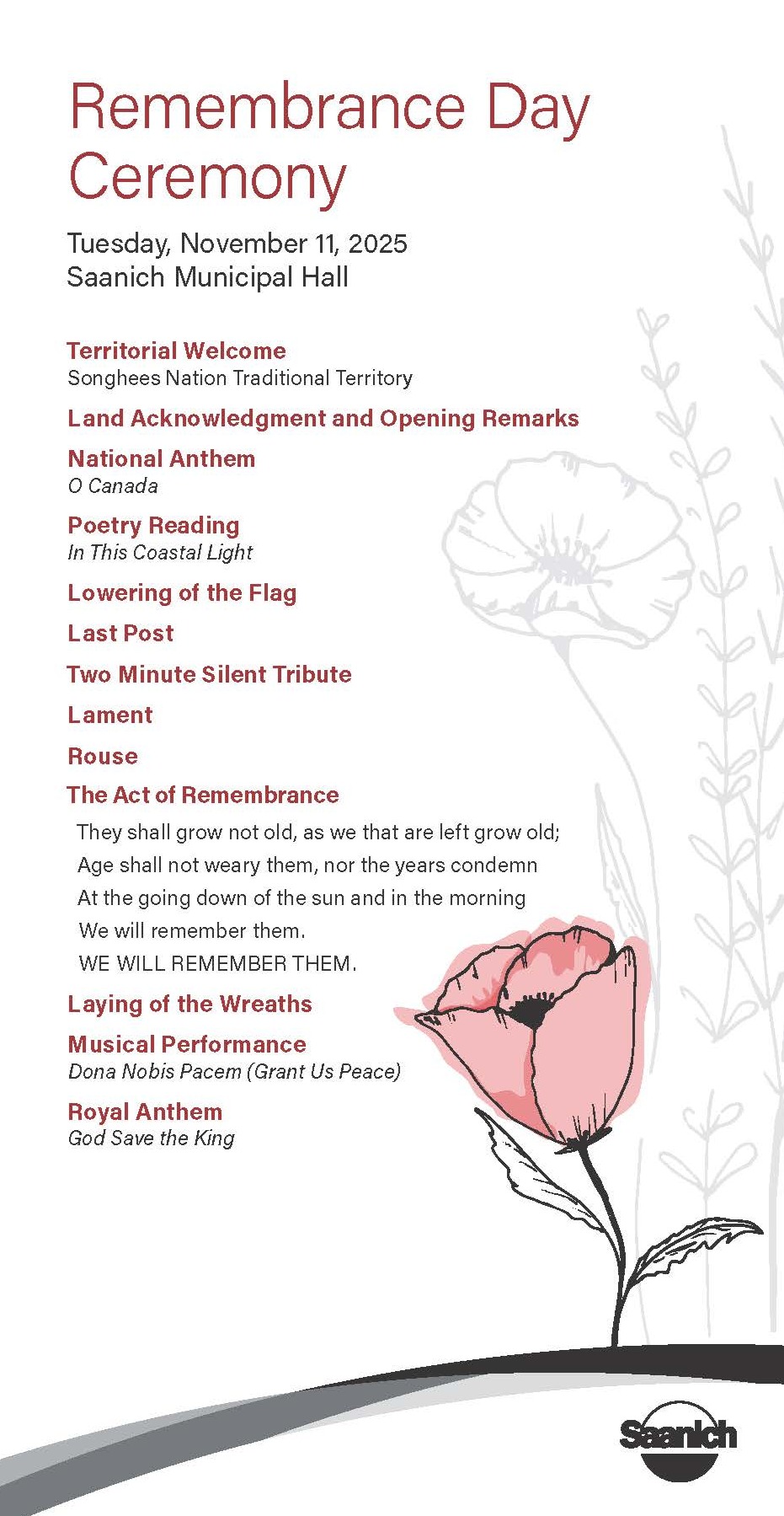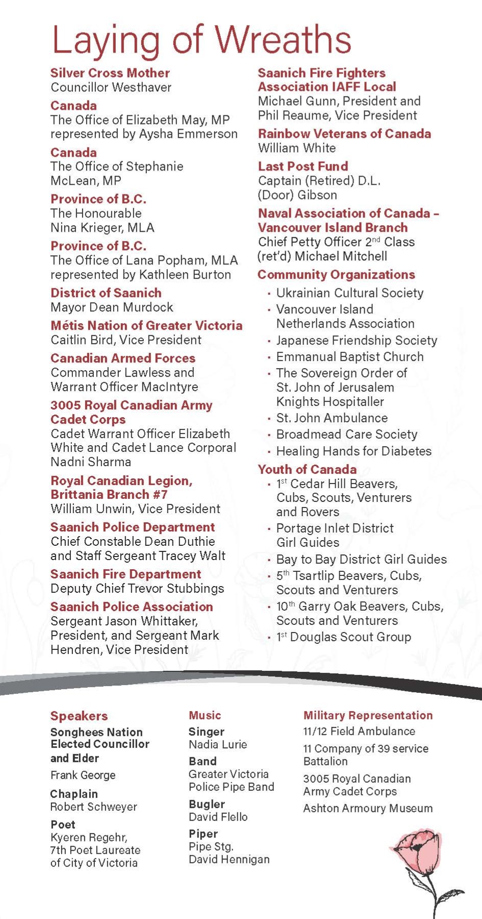 If you or your organization would like to lay a wreath, please email events@saanich.ca by Oct 15 to inquire. Please include:
