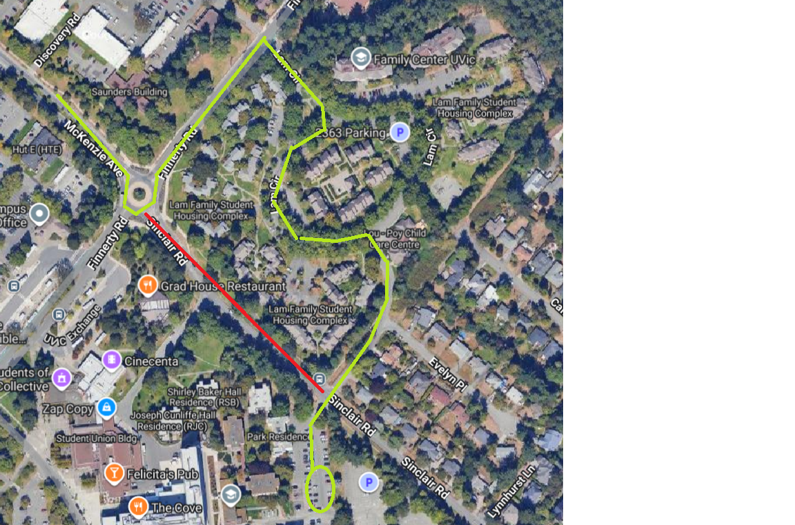 **Please Note: due to unforeseen circumstances, access to the shuttle park and ride is via Lam Circle, through the Lam Family Student Housing Comlex. Please follow signs. Parking and shuttle pick up zone will still be in UVic Lot 5.