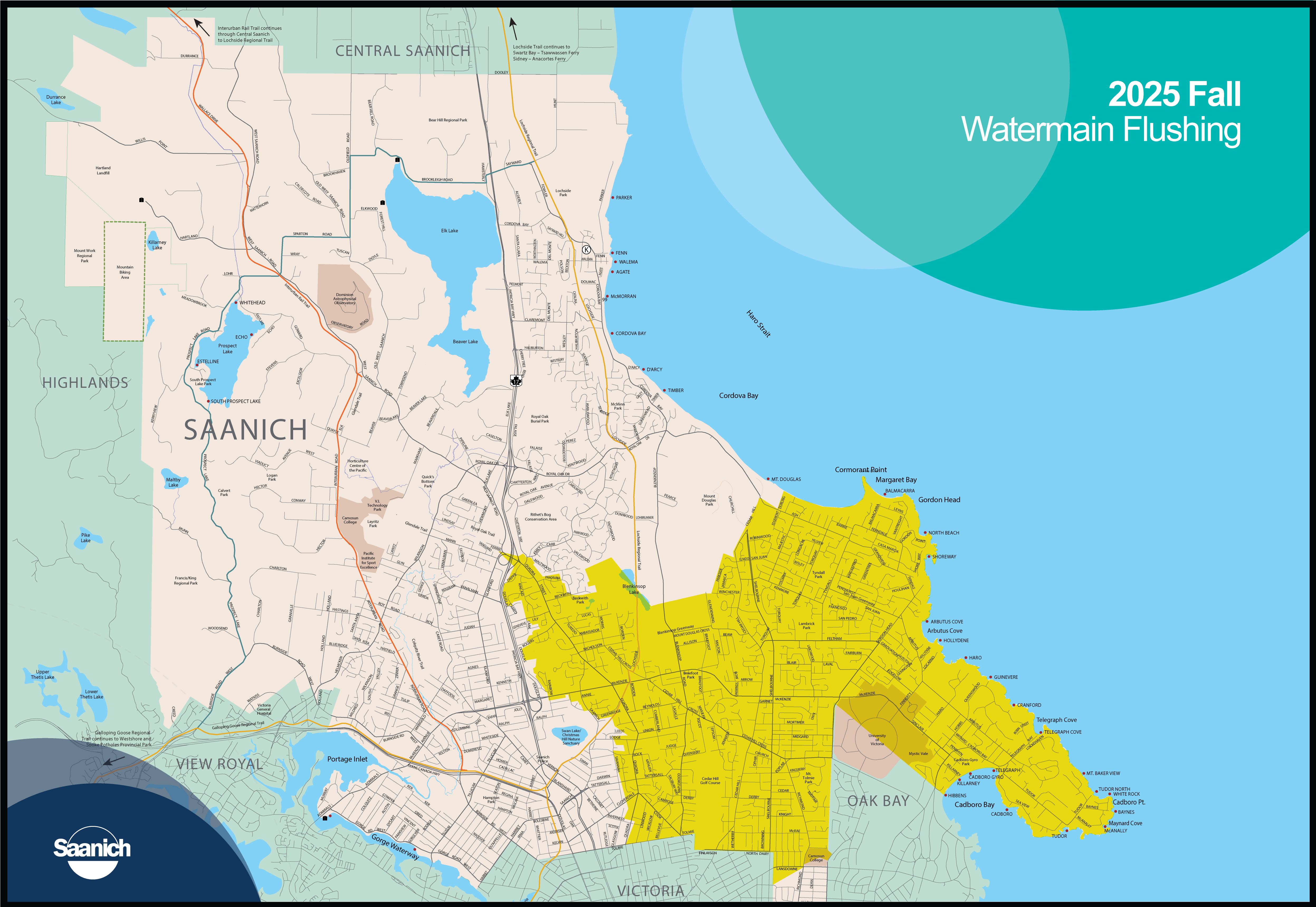 Freedom of Information and Protection of Privacy Act (FIPPA): Personal information contained in your email is collected pursuant to section 26(c) of FIPPA and will be only be used for the purposes of notifying you of watermain flushing. If you have questions regarding its collection and disclosure, contact the Saanich Information and Privacy Team, 770 Vernon Ave. Victoria, BC or by telephone (250) 475-1775.