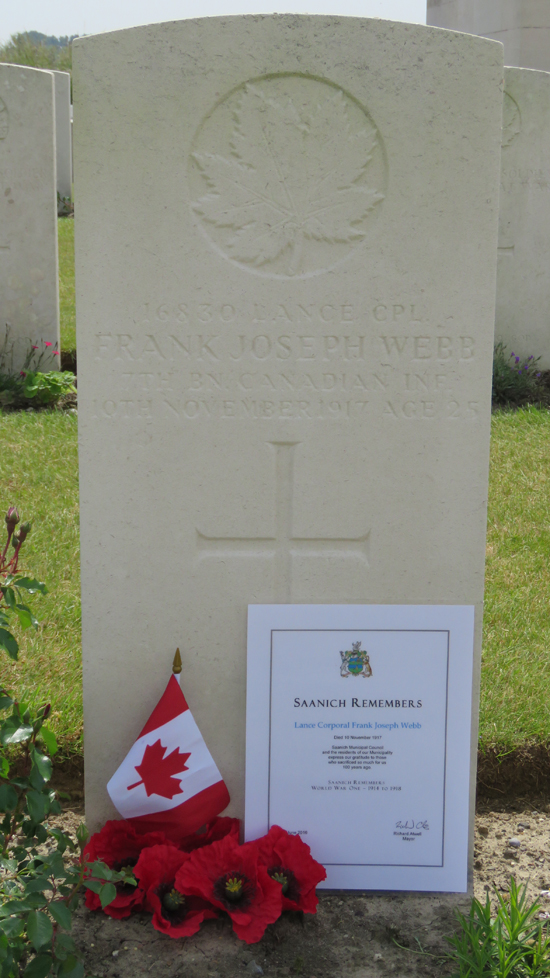 Killed in Action 10 November 1917. Service Number: 16830. Frank Webb was born in London, England on 7 November 1892 to parents Charles and Emma Webb. He was one of 14 children with 6 sisters and 7 brothers (one of whom died before the war). Three of Frank's brothers also served during WWI. Albert Victor Webb and Reuben Stanley Webb both joined the Navy in 1915. William Webb served in France with the Canadian Expeditionary Force. The family came to Canada in 1901, settling first on Dupplin Road and then Rowland Avenue in Saanich. Before the war, Frank worked as an upholsterer. He enlisted on 20 September 1914 in Valcartier, Quebec and served overseas with the 7th Battalion, and later with the 30th Battalion. On 15 December 1915, Frank married Sarah Ada Lundie, lacemaker, at St. John the Evangelist, Walworth, Southwark in England. While Frank’s Memorial Cross went to his mother, his other medals and decorations were sent to his widow. After Frank’s death, Sarah was living in Victoria for a time, but no further records as to her whereabouts after 1918 have been located at this time. Frank was killed in action on 10 November 1917. In June 2016, military researcher Steve Clifford visited cemeteries overseas as part of the Saanich Remembers Project, including Passchendaele New British Cemetery in Belgium (photographs courtesy of Steve Clifford). Additional information provided by L. Hanson. Service record | Commonwealth War Graves Commission | Canadian Virtual War Memorial | Passchendaele New British Cemetery | Grave | Article from Doing Our Bit blog, 10 Nov 2017