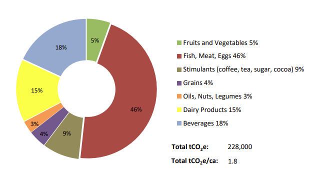 Pie chart shows overall GHG emissions from all food consumed in Saanich in kilotons of carbon dioxide equivalent (ktC02e) using a Consumption-Based Emissions Inventory. For more information, see ecocity Footprint Report.