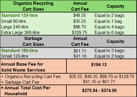 Households will be charged a solid waste services base fee of $194.13 and an annual cart fee for their organics recycling and garbage carts. Those who choose larger carts will pay more. This is known as a “use less, pay less” system and is based on everyone paying a fair share of waste management costs.