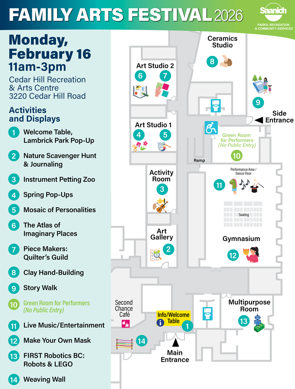 The Cedar Hill Arts and Recreation Centre is located at 3220 Cedar Hill Road. Most event activities take place inside the building, and one event activity, the story walk, is outside the building on the trail.