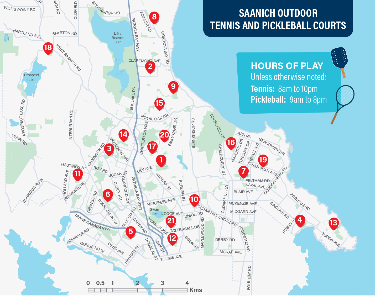 Saanich has 21 parks with tennis courts, including several with pickleball courts. Find a location near you on the map below.